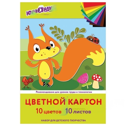 Картон цветной А4 немелованный, 10 листов, 10 цветов, в папке, ЮНЛАНДИЯ, 200х290 мм, "Бельчонок", 113555
