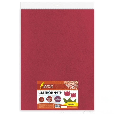 Цветной фетр для творчества, 400х600 мм, ОСТРОВ СОКРОВИЩ, 3 листа, толщина 4 мм, плотный, красный, 660658