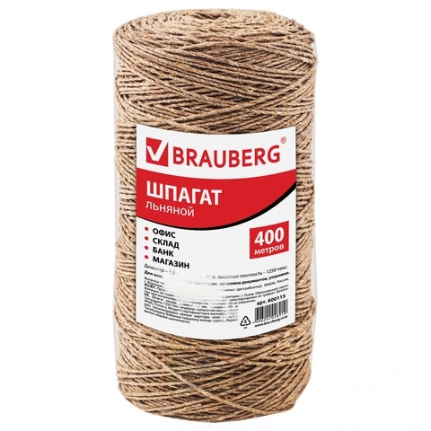 Шпагат льняной банковский, диаметр 1,5 мм, длина 400 м, линейная плотность 1250 текс, BRAUBERG, 600115