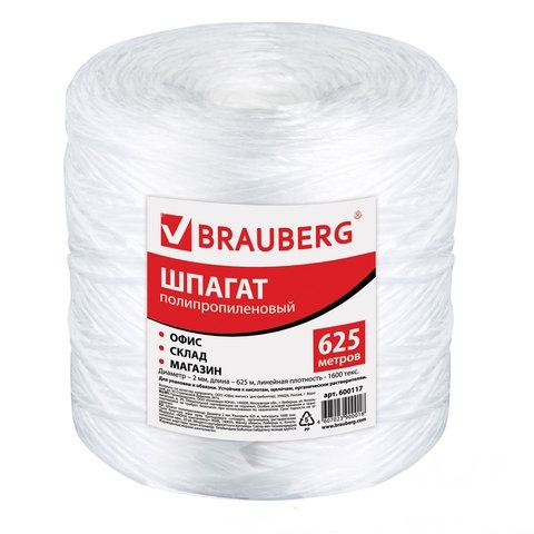 Шпагат полипропиленовый, длина 625 м, диаметр 2 мм, линейная плотность 1600 текс, BRAUBERG, 600117