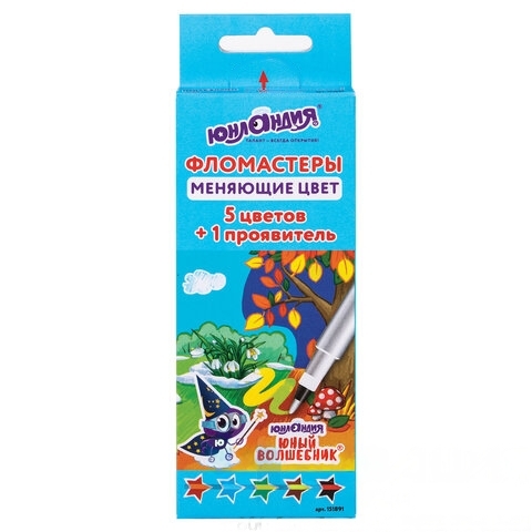 Фломастеры, меняющие цвет ЮНЛАНДИЯ 5 цветов + 1 проявитель, "ЮНЫЙ ВОЛШЕБНИК", вентилируемый колпачок, 151891