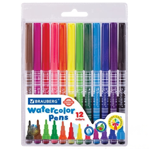 Фломастеры BRAUBERG "PREMIUM", 12 цветов, КОРПУС С ПЕЧАТЬЮ, вентилируемый колпачок, ПВХ-упаковка с европодвесом, 151942