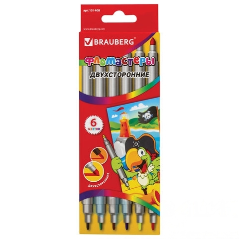 Фломастеры двухсторонние BRAUBERG 6 цветов, пишущие узлы 2 и 5 мм, вентилируемый колпачок, картонная упаковка, 151408