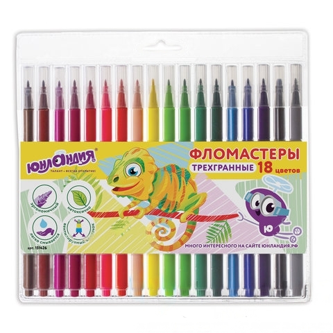 Фломастеры ЮНЛАНДИЯ 18 цветов, "ЗООПАРК", трехгранные, вентилируемый колпачок, 151426