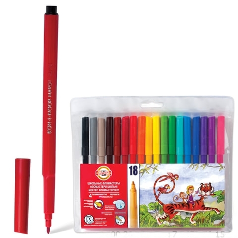 Фломастеры KOH-I-NOOR, 18 цветов, смываемые, трехгранные, пластиковая упаковка, европодвес, 771002AH04TERU