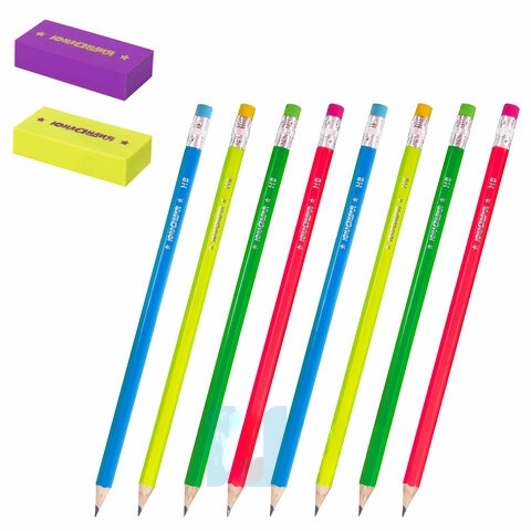 Набор ЮНЛАНДИЯ "Неончики": 8 карандашей чернографитных HB + 2 ластика, блистер, 181783