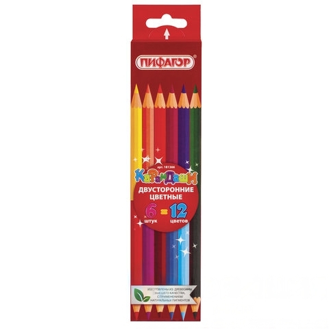 Карандаши двусторонние ПИФАГОР, 6 штук, 12 цветов, заточенные, европодвес, 181366