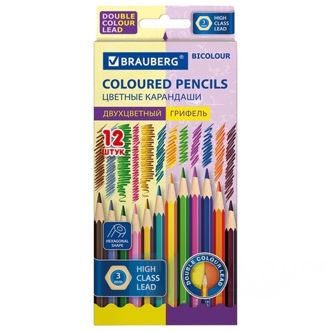 Карандаши с двухцветным грифелем BRAUBERG BICOLOUR, 12 штук, 24 цвета, 181855