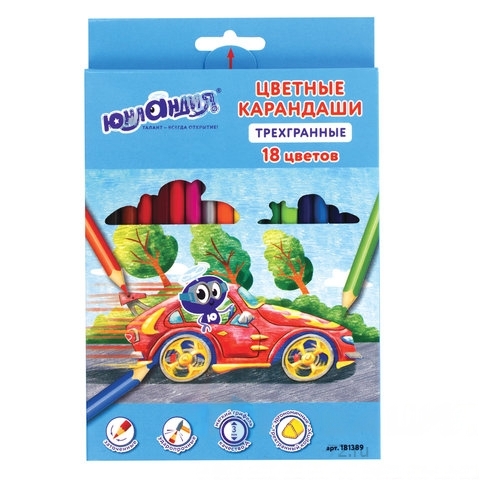 Карандаши цветные ЮНЛАНДИЯ "ЮНЛАНДИК БЫСТРЕЕ ВСЕХ", 18 цветов, трехгранные заточенные, 181389