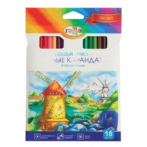 Карандаши цветные ГАММА "Классические", 18 цветов, заточенные, шестигранные, картонная упаковка, 05091803, 050918_03
