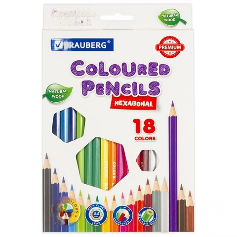Карандаши цветные BRAUBERG PREMIUM, 18 цветов, шестигранные, грифель мягкий 3,3 мм, 181657