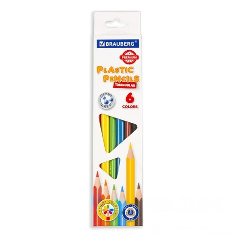 Карандаши цветные пластиковые BRAUBERG PREMIUM, 6 цветов, трехгранные, грифель мягкий 3 мм, 181660