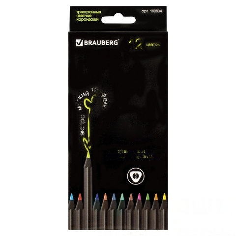 Карандаши цветные BRAUBERG "Black Jack", 12 цв., трехгранные, черное дерево, заточенные, картонная упаковка, 180834