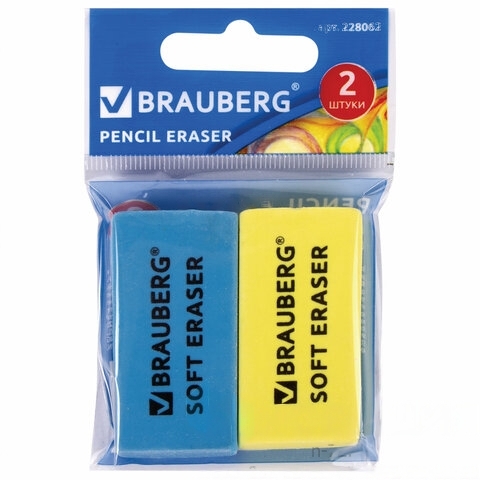 Набор ластиков BRAUBERG "Soft" 2 шт., 52х25х9 мм, цвет ассорти, прямоугольные, скошенные края, 228062