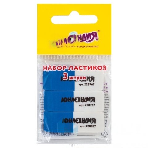 Набор ластиков ЮНЛАНДИЯ "Школьные", 3 шт., 41х14х8 мм, сине-белые, 228767