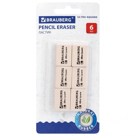Ластики BRAUBERG "Ultra Square" 6 шт., размер ластика 29х18х8 мм, белые, натуральный каучук, 229603