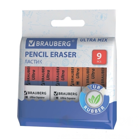 Ластики BRAUBERG "Ultra Mix" 9 шт., размер ластика 41х14х8 мм/29х18х8 мм, натуральный каучук, 229604