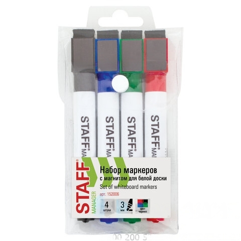 Маркеры для белой доски на магните со стирателем, НАБОР 4 цвета, 3 мм, STAFF "Manager", 152006