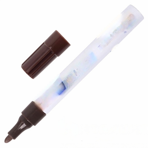 Высококачественные чернила коричневого цвета с лаковым эффектом идеально подходят для нанесения долговечной маркировки на любые поверхности. Благодаря усиленной формуле чернил краска ложится ровным слоем, полностью закрашивая поверхность. С помощью круглого прочного наконечника, выполненного из пористого акрила с шириной линии письма 4 мм, можно легко наносить широкие линии. Быстросохнущие чернила предотвращают смазывание в процессе маркировки. После высыхания надписи становятся термо- и водостойкими, а также устойчивыми к выцветанию и механическому истиранию. Отлично подходит для маскировки бытовых дефектов, таких как царапины и сколы. Надежный помповый механизм подачи чернил предотвращает вытекание и разбрызгивание в процессе использования, а также преждевременное высыхание. Корпус маркера выполнен из алюминия, внутри находятся 2 металлических шарика для взбалтывания краски. Цвет колпачка соответствует цвету чернил.