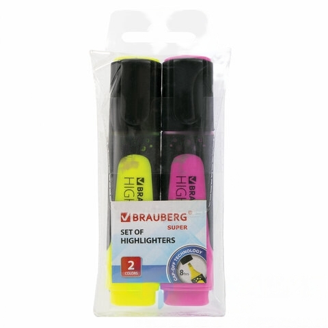 Набор текстовыделителей BRAUBERG 2 шт., ЖЕЛТЫЙ/РОЗОВЫЙ, "SUPER", прорезиненный корпус, линия 1-5 мм, 151745