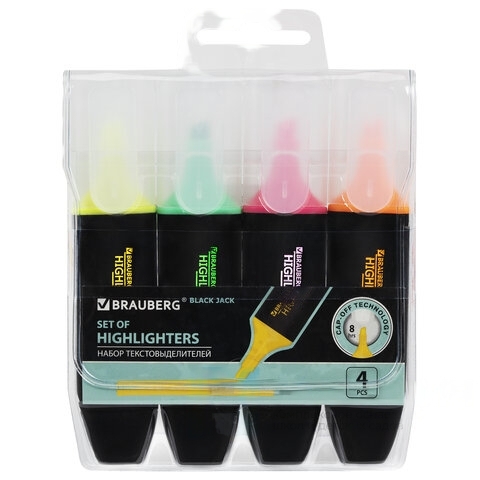 Набор текстовыделителей BRAUBERG 4 шт., АССОРТИ, "BLACK JACK", линия 1-5 мм, 151893