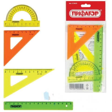Набор чертежный малый ПИФАГОР (линейка 16 см, 2 треугольника, транспортир), неоновый, европодвес, 210625