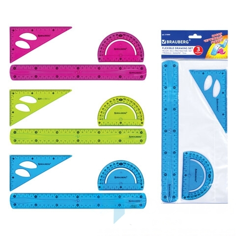 Набор чертежный большой гибкий BRAUBERG "FLEX" (линейка 30 см, треугольник, транспортир), ассорти, 210680