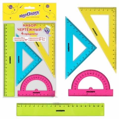 Набор чертежный средний ЮНЛАНДИЯ "Color", (линейка 20 см, 2 треугольника, транспортир), 210755