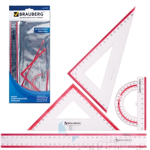 Набор чертежный большой BRAUBERG "Crystal" (линейка 30 см, 2 угольника, транспортир), выделенная шкала, 210297