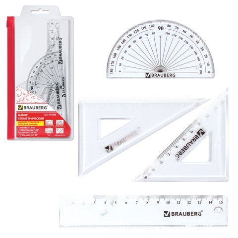 Набор чертежный малый BRAUBERG (линейка 15 см, 2 угольника, транспортир), конверт на молнии, 210306