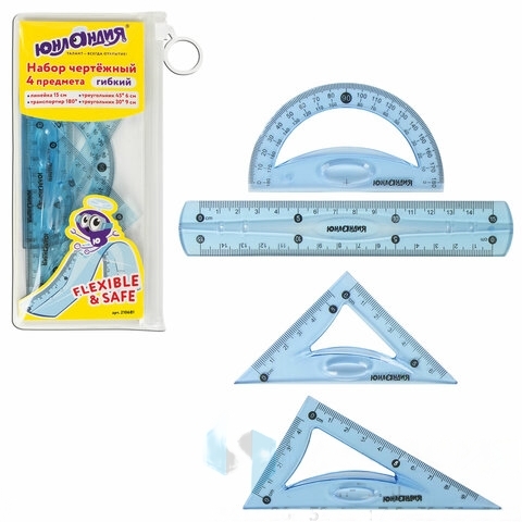 Набор чертежный малый гибкий ЮНЛАНДИЯ "FLEX" (линейка 15 см, 2 треугольника, транспортир), пенал, 210681