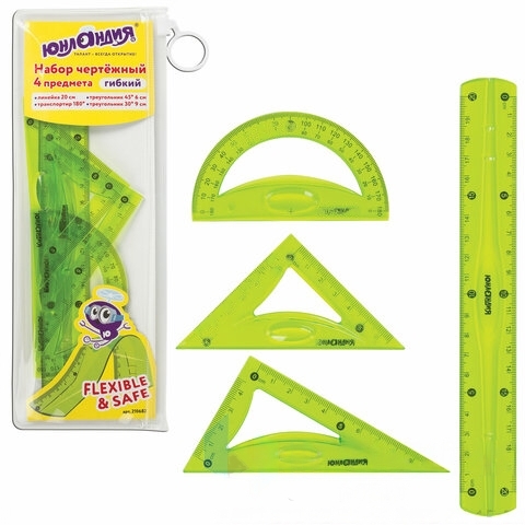 Набор чертежный средний гибкий ЮНЛАНДИЯ "FLEX" (линейка 20 см, 2 треугольника, транспортир), пенал, 210682