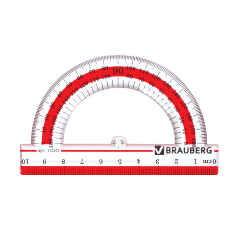 Транспортир 10 см, 180 градусов, пластиковый, BRAUBERG "Crystal", прозрачный, с выделенной шкалой, подвес, 210292