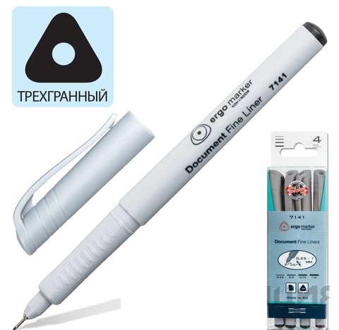 Набор капиллярных ручек (линеров) KOH-I-NOOR 4 шт., ЧЕРНЫЕ, трехгранные, линия письма 0,25/0,5/0,75/1 мм, 777141JD01PK