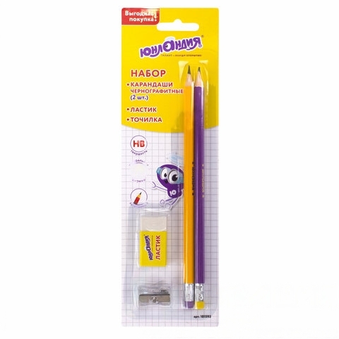 Набор ЮНЛАНДИЯ "Школьный", 2 карандаша чернографитных, резинка стирательная, точилка, блистер, 181593