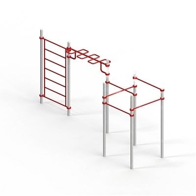 Комплекс условно делится на 2 секции, в одной из них перекладины и стойки, поставленные по углам квадрата. Вторая секция включает в себя последовательно расположенные стойки с закрепленными между ними лазом и рукоходом.