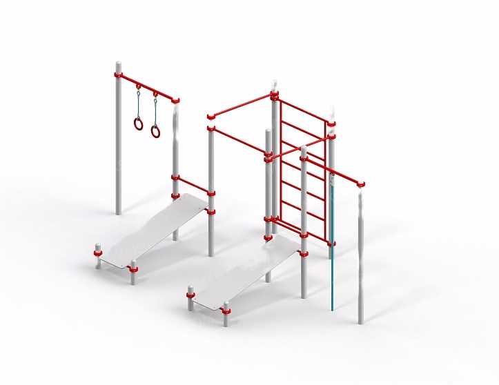 Гимнастические кольца изготавливаются из пластика или влагостойкой фанеры и закрепляются на гибких подвесах. Настил скамьи фанерный влагостойкий. Перекладины и стойки металлические, с гладкими сварными швами. Между 2-х стоек закрепляется полиамидный или полипропиленовый канат.