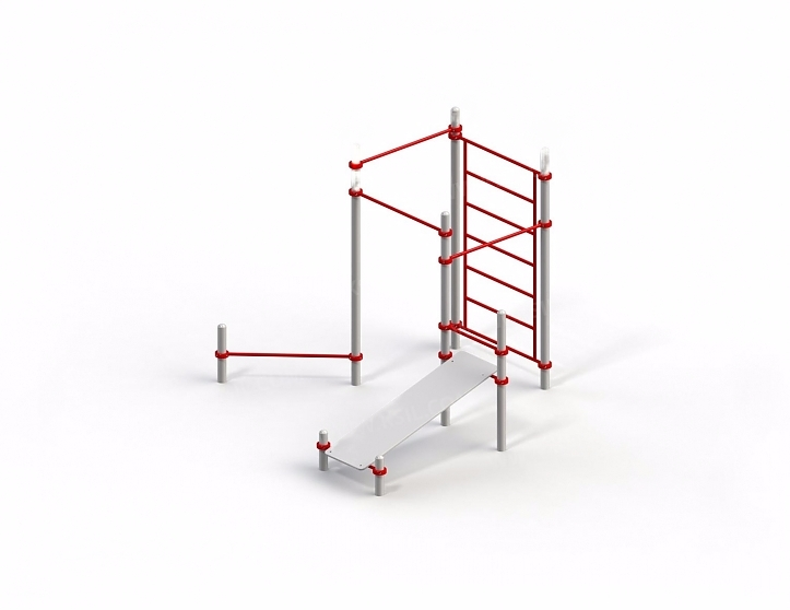 В составе комплекса: 8 несущих стоек, перекладины, шведская стенка, скамья для пресса.