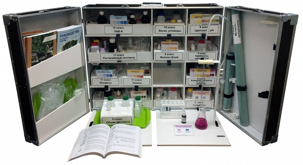 В левой дверце кейса: методические пособия, документация, набор реагентов, дополнительные инструменты.