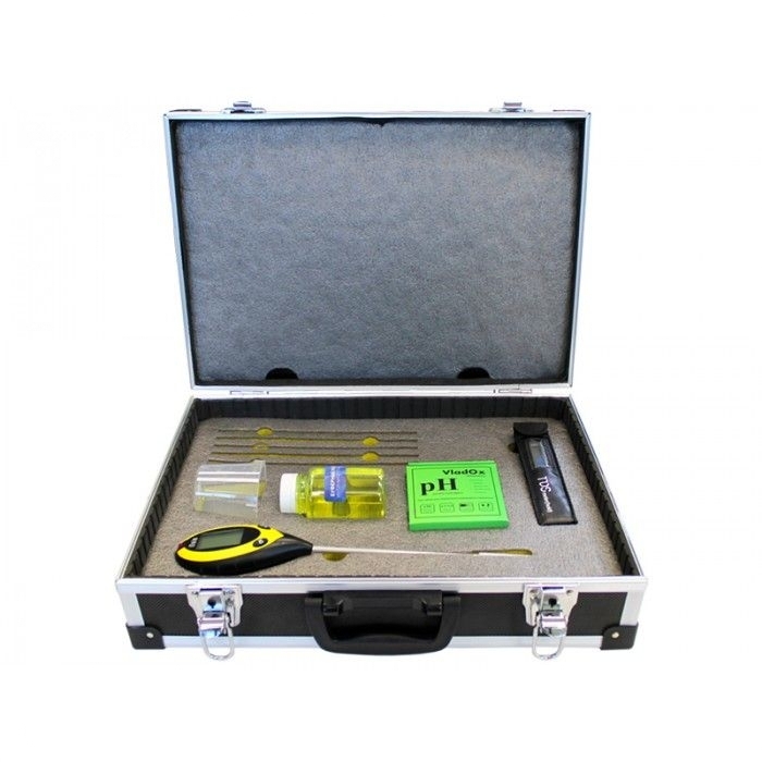Комплект представлен инструментами и приборами для определения качества воды и почвы. Химико-биологические параметры фиксируются TDS-метром, pH-метром. В комплекте стакан, калибровочный раствор, стеклянная палочка.
