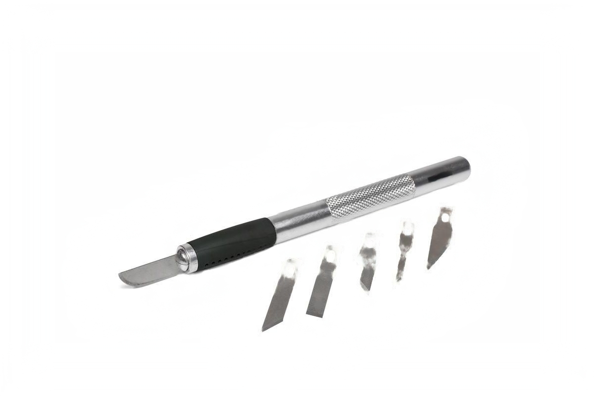 Комплект ножей с 1 металлической рукояткой и 6-ю сменными лезвиями в форме пера подходит для нарезания мягких материалов: кожи, резины, ткани, картона.