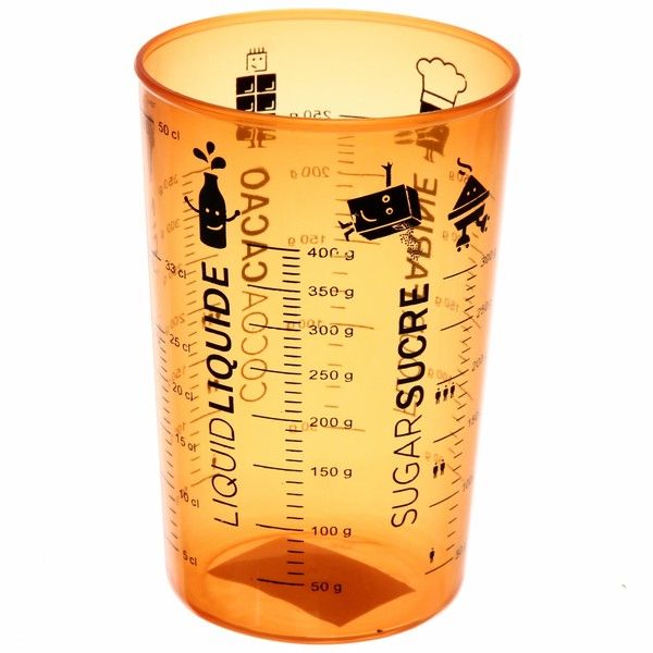 Цветной пластиковый стакан объемом 400 мл украшается рисунками. Посуда оснащена мерной шкалой для жидкостей и шкалой для сыпучих продуктов.
