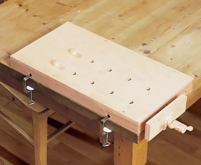 Верстак прикрепляется к любому столу и не дает оставить на нем царапины во время работы с фанерными элементами. Специальные ограничители и зажимы удерживают заготовку во время выпиливания.