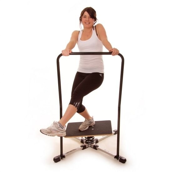 Человек пытается удержать равновесие на платформе, держась за поручень Основанием служит крестовина с пружиной в центре. Углы поручня закруглены.