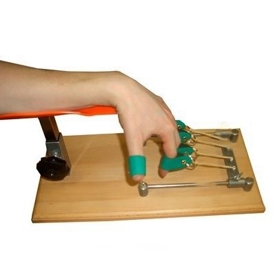 Предплечье фиксируется на подставке. Пальцы вставляются в петли из резиновых жгутов.