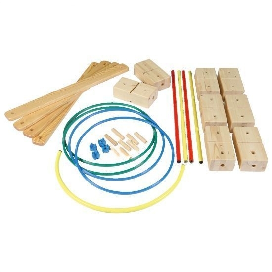 В комплекте: блоки гимнастические (8 шт.), доски балансировочные (4 шт.), палки гимнастические (4 шт.), обручи гимнастические (4 шт.), фиксаторы, полуобруч.