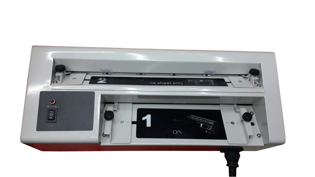 Резка осуществляется вдоль длинной стороны листа, затем поперек. Аппарат подходит для листов размером 210х297 мм.