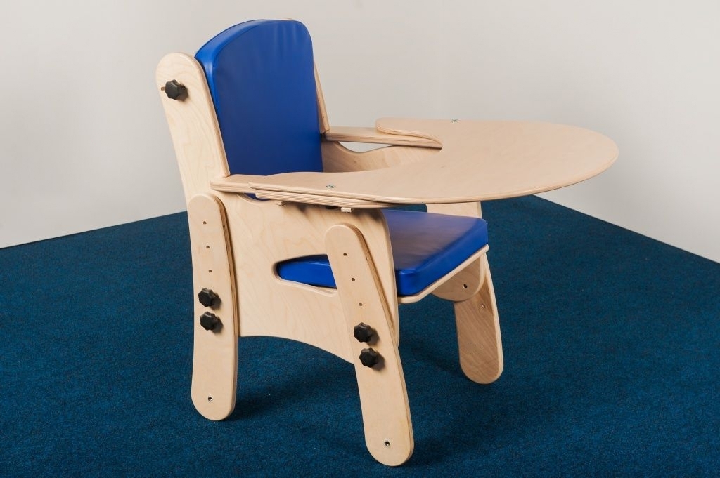 Полукруглая фанерная поверхность с эргономичной выемкой покрыта безопасным лаком, устанавливается на подлокотники. Выдвигается на 75 мм. За столиком ребенок питается, играет, выполняет задания.