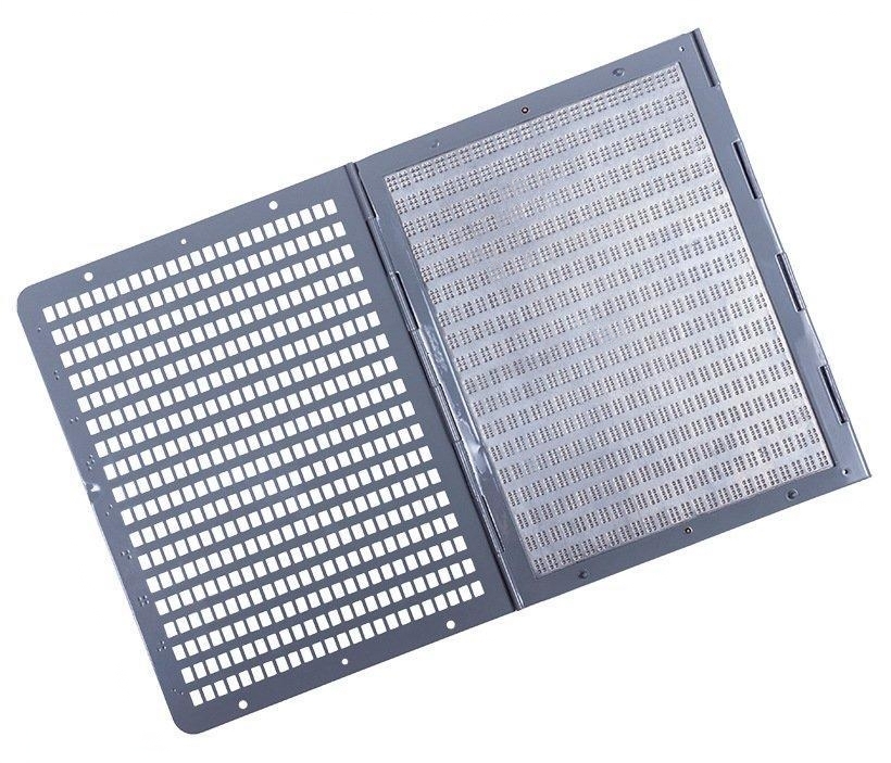 Лист специальной бумаги фиксируется между пластиной-рамкой и решеткой. Прямоугольные клетки (7,25x4,65 мм) для продавливания точек выстроены в 18 строк (по 24 клетки в каждой).