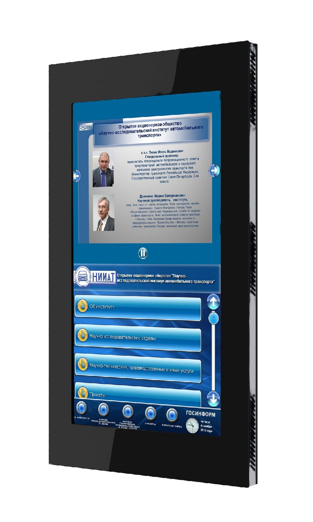 Сенсорный экран с повышенной яркостью считывает от 2-х касаний. Пользователь загружает видеоролики и презентации, виртуальные справочники, галереи, визитки учреждения.